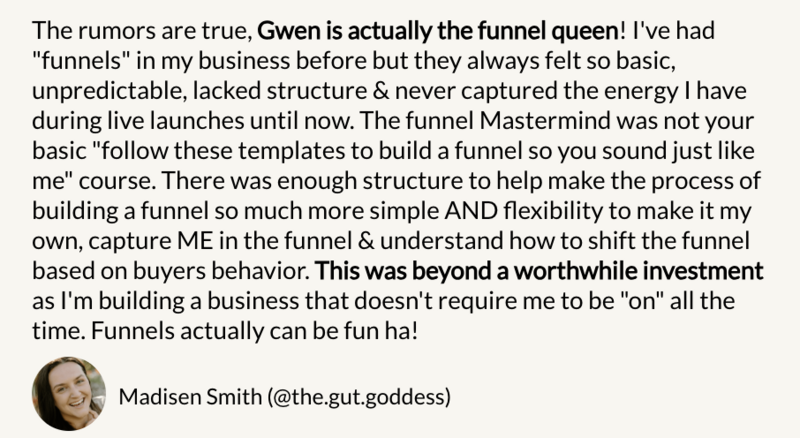 Madisen loved how simple and flexible the funnels taught inside Funnel Queen Mastermind were. "This was beyond a worthwile investment".
